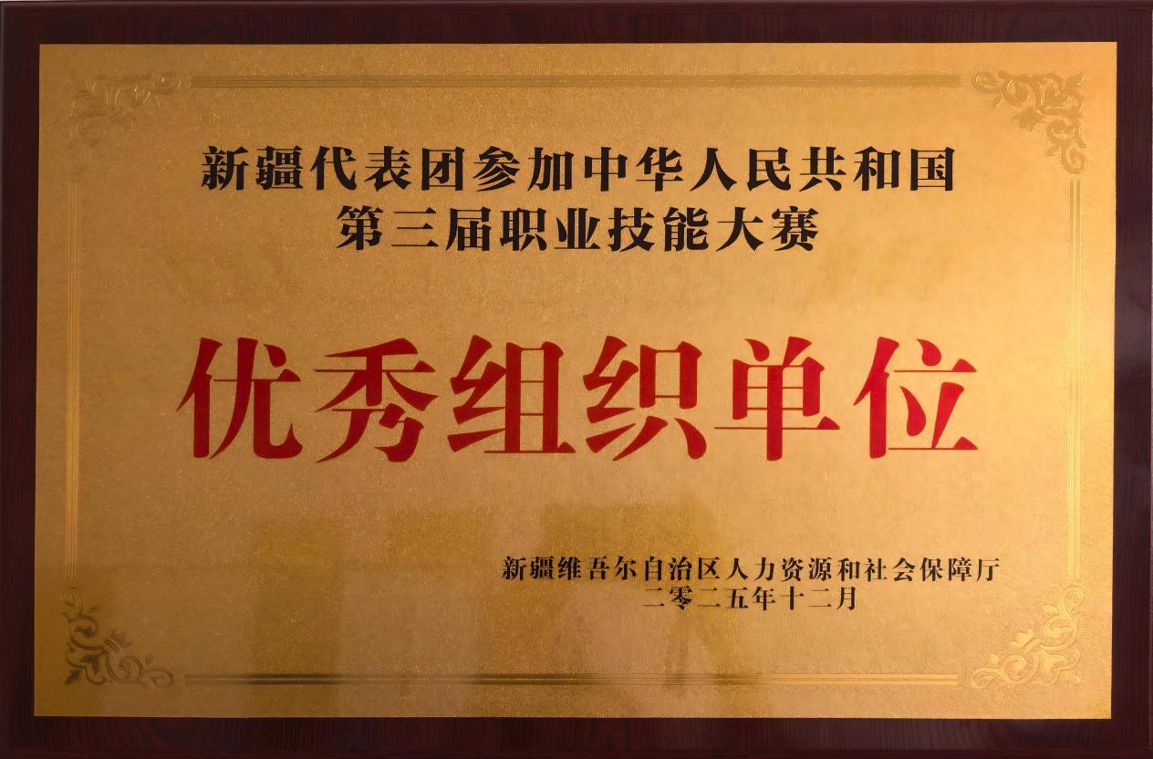 12 月 26 日,自治区人力资源和社会保障厅召开新疆代表团第三届全国技能大赛暨创新创业大赛总结会,我校荣获 “优秀组织单位” 称号。