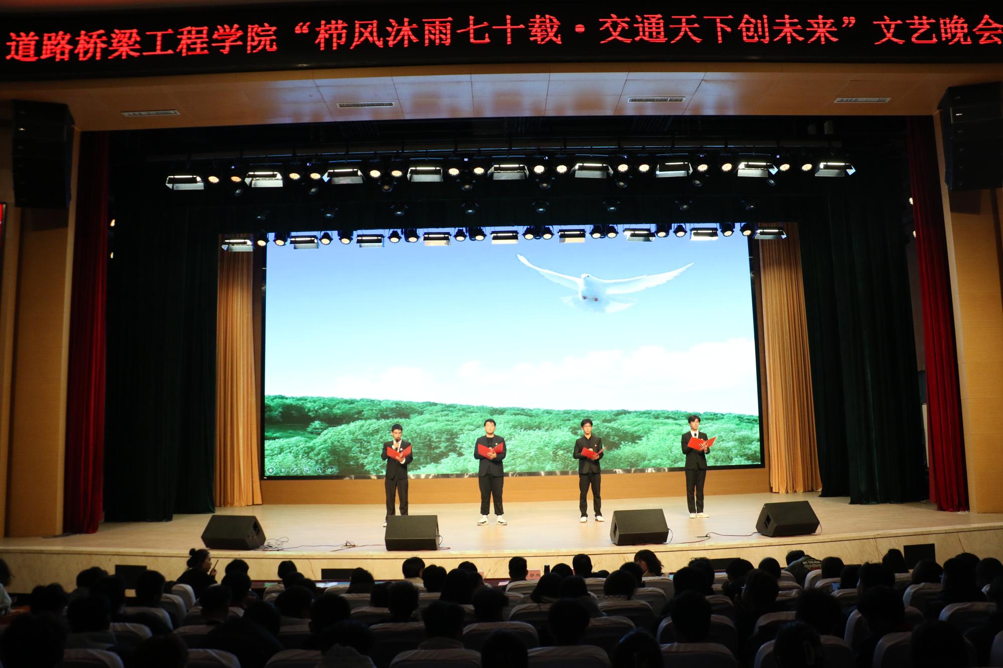 在秋已尽,冬将至的日子里。11月16日晚自习,道路桥梁工程学院在产教楼礼堂举办“栉风沐雨七十载•交通天下创未来”文艺晚会,全院师生代表在这里欢聚一堂,一同观看演出,共享文化盛宴。