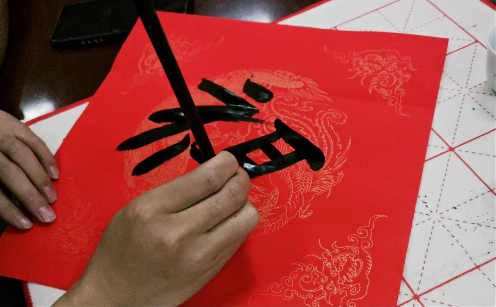 品味完美味的汤圆后,伴着茶香,同学们铺展红纸,凝神聚气,挥毫泼墨,在红艳艳的斗方上书写福字。一停一顿、一起一落间,一幅幅风格多样、寓意吉祥的春联和“福”字在笔下绽放。写好“福”字后,同学们纷纷将自己的作品小心翼翼地收好,打算寒假带回家乡,将这份美好的祝福送给家乡的亲朋好友、社区老人和工作人员,让家乡人民也能感受节日欢乐祥和的氛围,同时用实践回报家乡,践行感恩、孝亲、亲仁、善邻的中华优秀传统文化内涵。