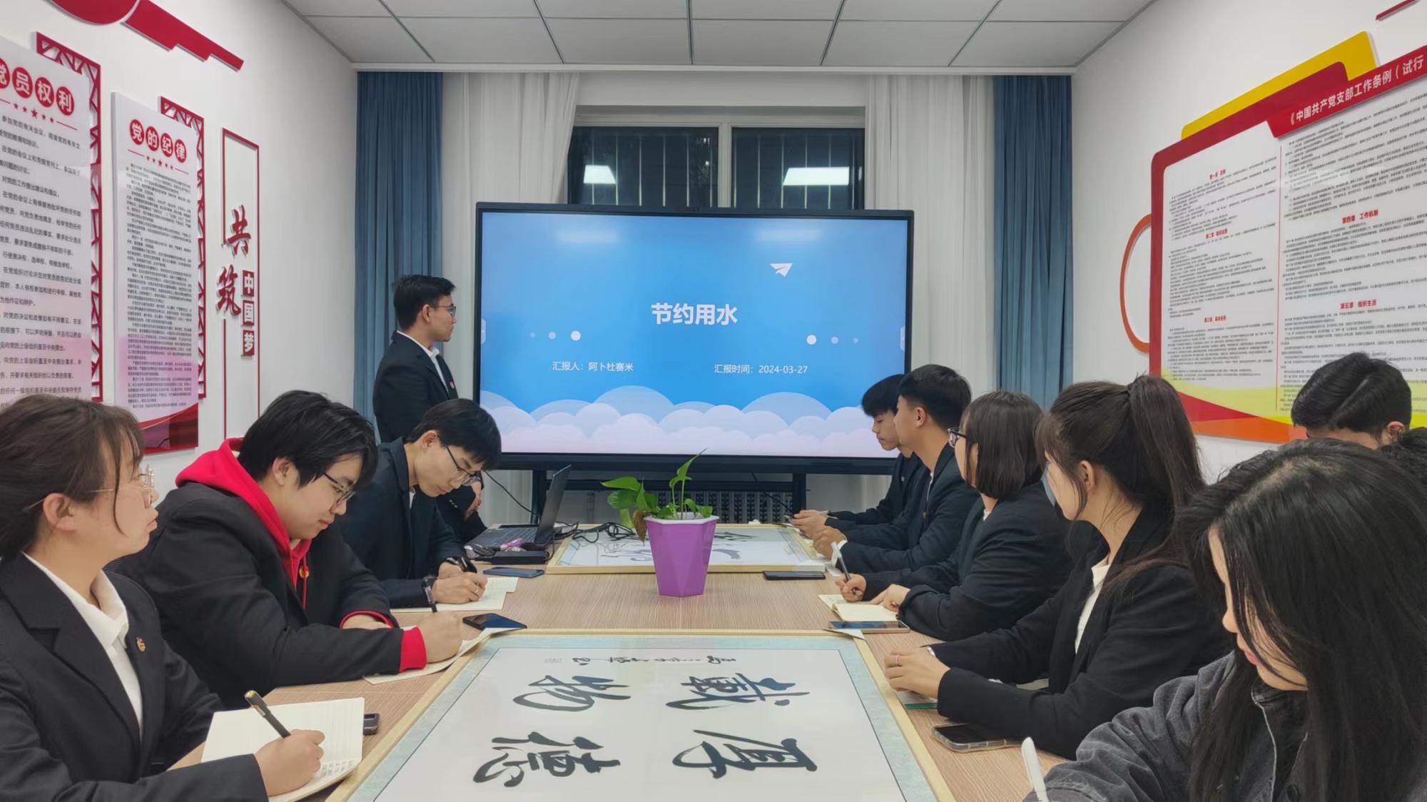 会上,阿卜杜赛米·吾普尔江同学带领全体入党申请人学习节约用水的重要性及节水的途径和方法,并分享了自己在日常生活中节约用水的小妙招。