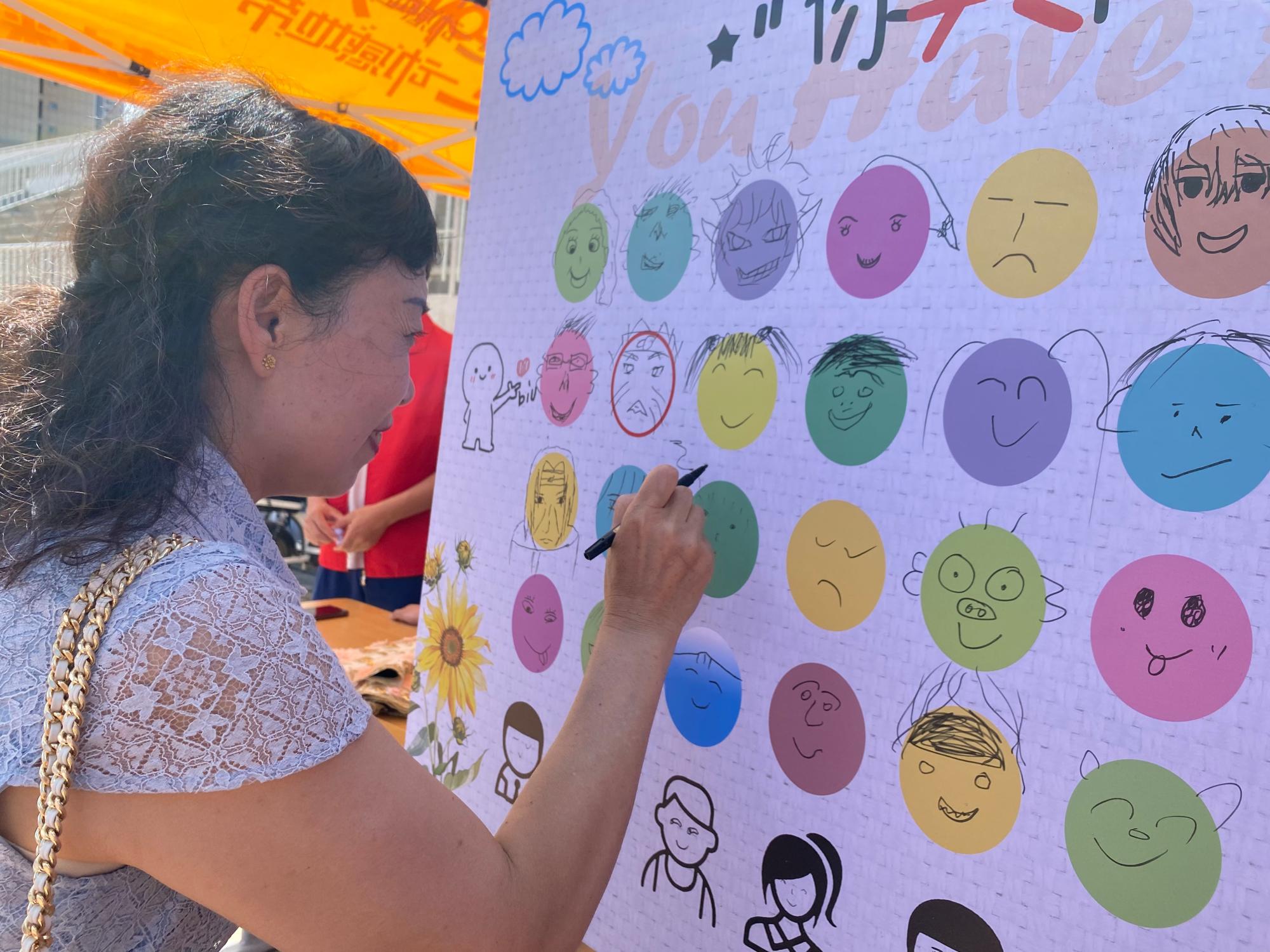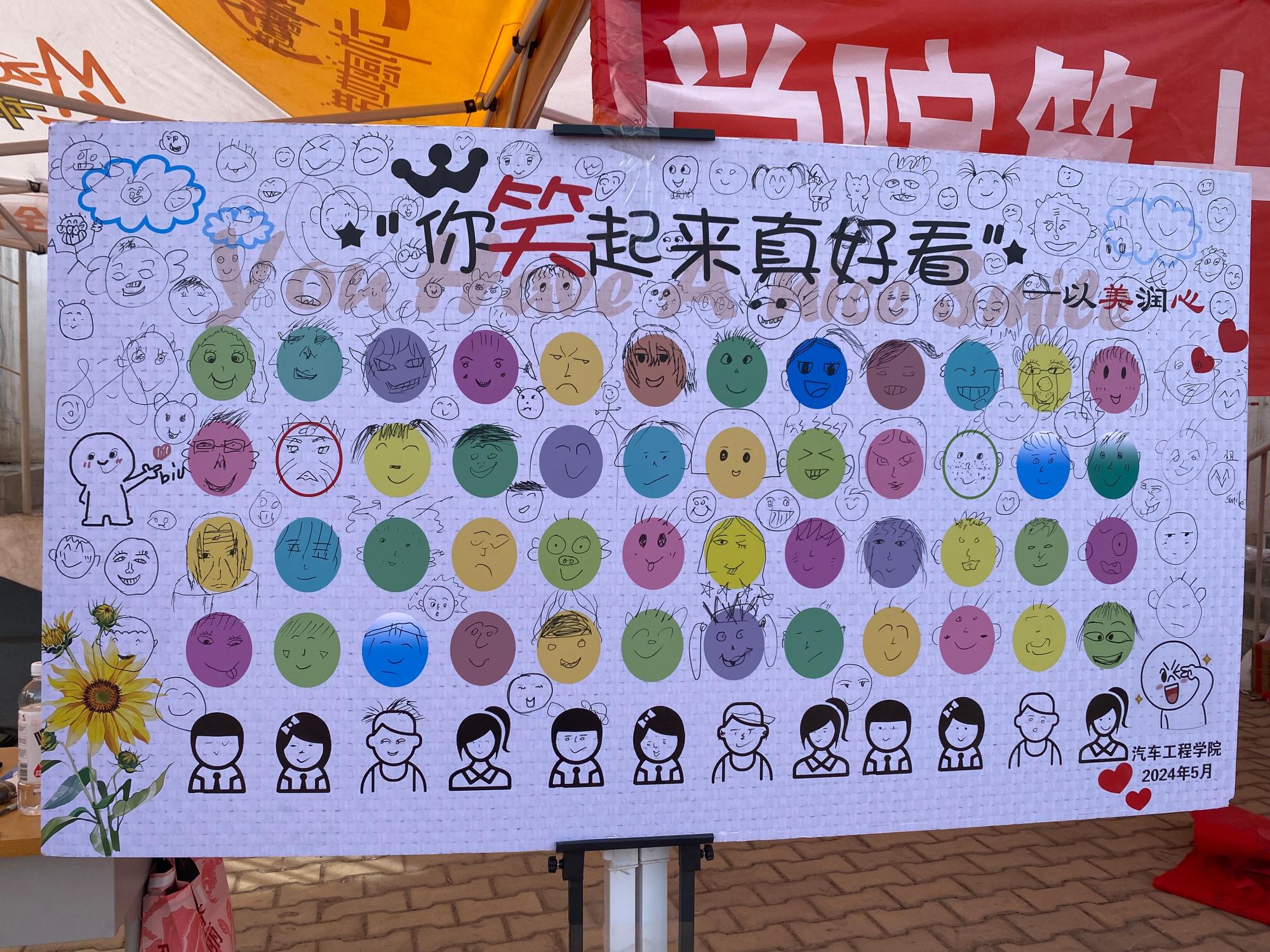 活动现场,工作人员设立展板,邀请参加游园会的师生在展板上画出自己的笑脸。师生们纷纷驻足参与活动,不一会儿,展板上就画满了笑脸,每个笑脸都是独一无二的,承载着同学们的创意和爱意。