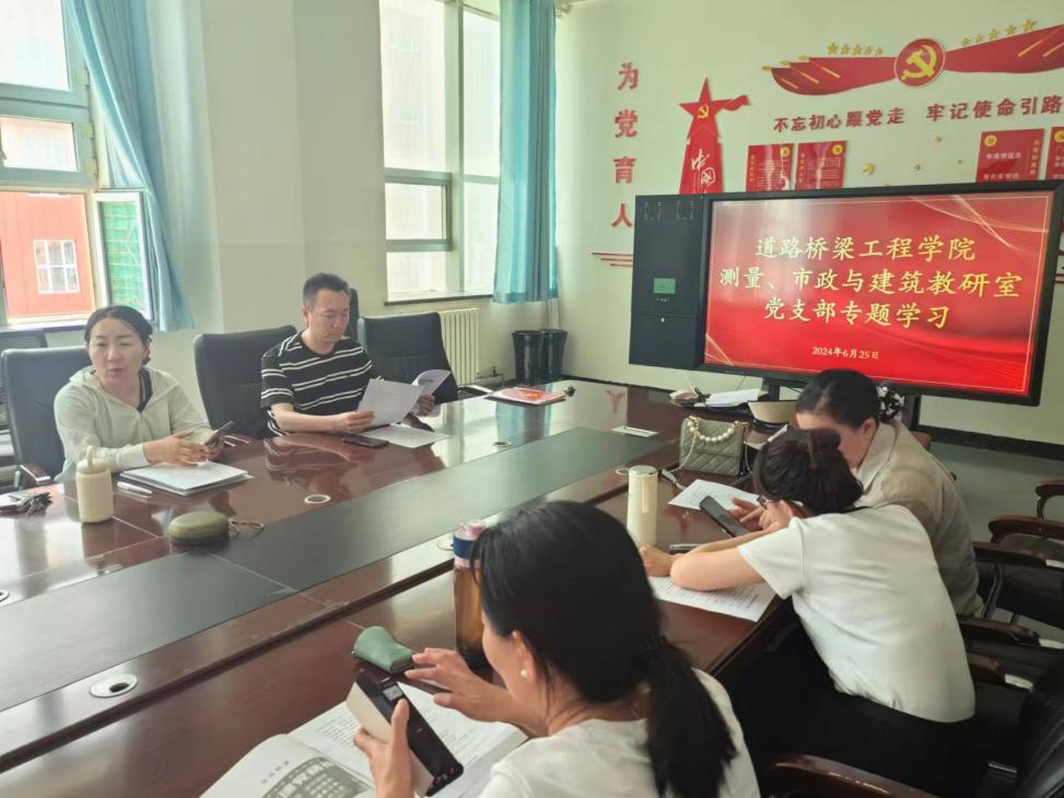 为推动党纪学习教育走深走实,强化党员干部的纪律意识,6月25日下午,道路桥梁工程学院测量及建筑市政教研室党支部开展党纪学习教育专题学习讨论会。道路桥梁工程学院副院长热汗古丽出席会议,会议由党支部书记杨磊主持。