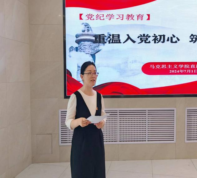马克思主义学院副院长、组织委员高龙跃表示希望马院全体党员干部时刻牢记党的初心和使命,敢于牺牲、勇于担当、敢于斗争;要深化新修订《条例》的学习,破解思想“无惧”,筑牢思想根基;要坚持以思促行,严格遵规守纪,破解心中“无戒”;要坚持以行促效,提升工作实效,破解行动“无为”,不断深化党纪学习教育,以高质量的党纪学习教育助推马克思主义学院工作的高质量发展。