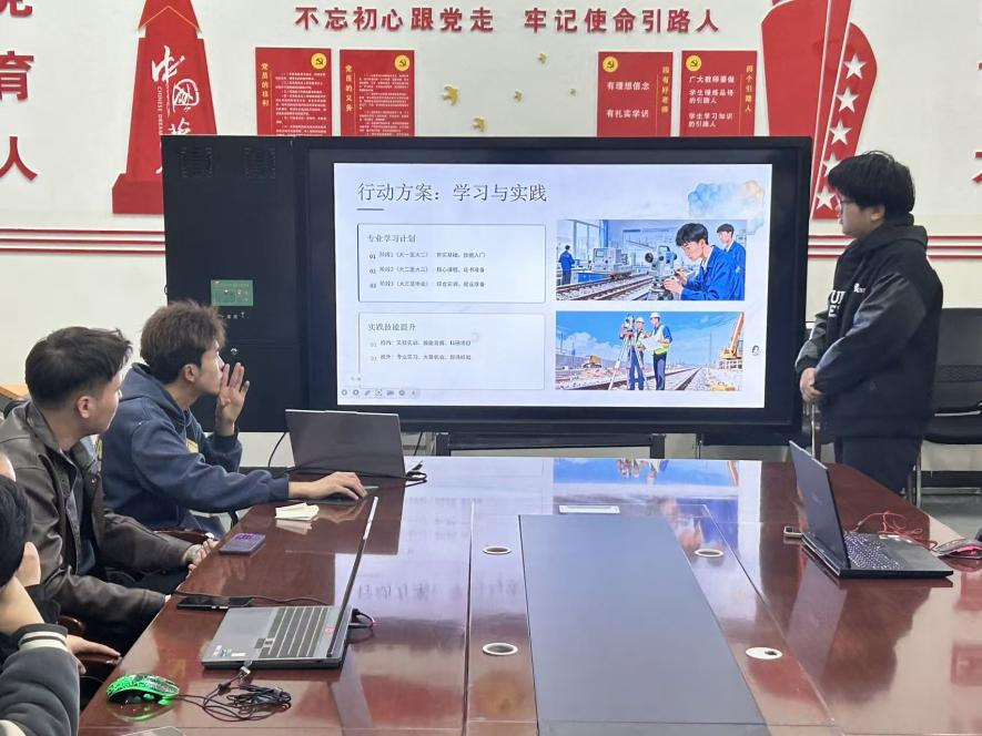 活动现场氛围热烈,社团社长、铁道工程技术专业王涛同学紧扣国家“八纵八横”高铁网络建设战略机遇,确立以乌鲁木齐铁路局工务段为职业发展目标,计划从基层线路工岗位起步,深耕线路检测与维护核心技术,致力于成长为铁路智能化养护领域的技术骨干。道路桥梁工程专业的马鹏飞同学则聚焦国家重点交通工程建设需求,以“成为优秀路桥工程师”为职业愿景,提出通过考取二级建造师等职业资格证书夯实专业资质,为未来参与重大工程建设储备核心竞争力。两位同学的分享展现了“专业锚定行业、个人融入国家”的规划视野,引发在场同学强烈共鸣。