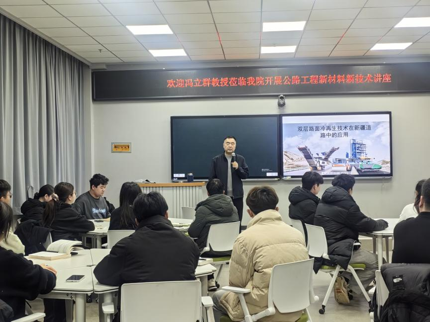 12月2日上午,道路桥梁工程学院邀请新疆公路建设行业知名专家冯立群教授在综合教学楼7楼智慧教室开展题为《双层路面冷再生技术在新疆道路上的应用》的专题讲座。讲座由学院副院长热汗古丽・买买提主持,道路桥梁工程学院土木G221班全体学生和部分教师参加此次讲座。